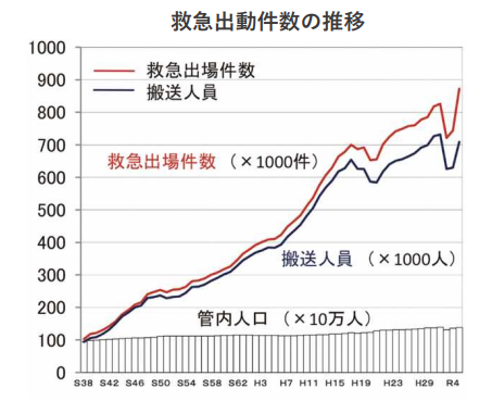 救急出動件数は年々増加の一途を辿っており、2022年(令和4年)中は過去最多の872,075件となりました。今後も救急出動件数は増加することが予想されます。